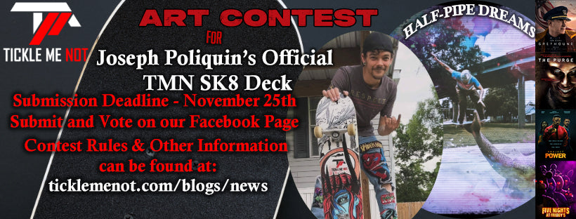 We are honored to have Joseph Poliquin join our team as our 2nd Official Team Skater. You may know of him from such films as "Five Nights at Freddy's", "Project Power", "Northern Shade", "The Purge", and many others. To celebrate we are launching an art contest for his first Official Signature Tickle Me Not Skateboard deck.